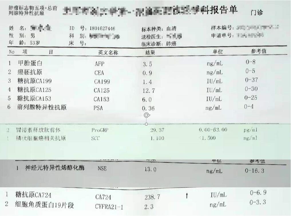 男性,53歲,頭暈半月入院,CT發(fā)現(xiàn)肺內(nèi)腫塊,雙肺多發(fā)大小不等實(shí)性及粟粒樣結(jié)節(jié),雙肺門(mén)及縱隔多發(fā)腫大淋巴結(jié)。病程中無(wú)發(fā)熱、胸悶氣及胸部不適。既往:左側(cè)肋骨外傷史。
