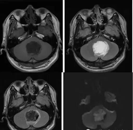 ②T1加權(quán)絕大部分為均勻的低信號,少數(shù)由于瘤體內(nèi)含液態(tài)膽固醇或出血而呈高信號影。T2加權(quán)呈明顯的、均勻一致的高信號影,高于腦脊液信號;DWI可見高信號。