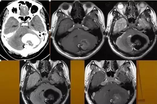 CT表現(xiàn):平掃腫瘤呈球形低密度,邊緣銳利,CT值低于腦脊液,但高于脂肪密度,看不到囊壁,無強(qiáng)化效應(yīng)。