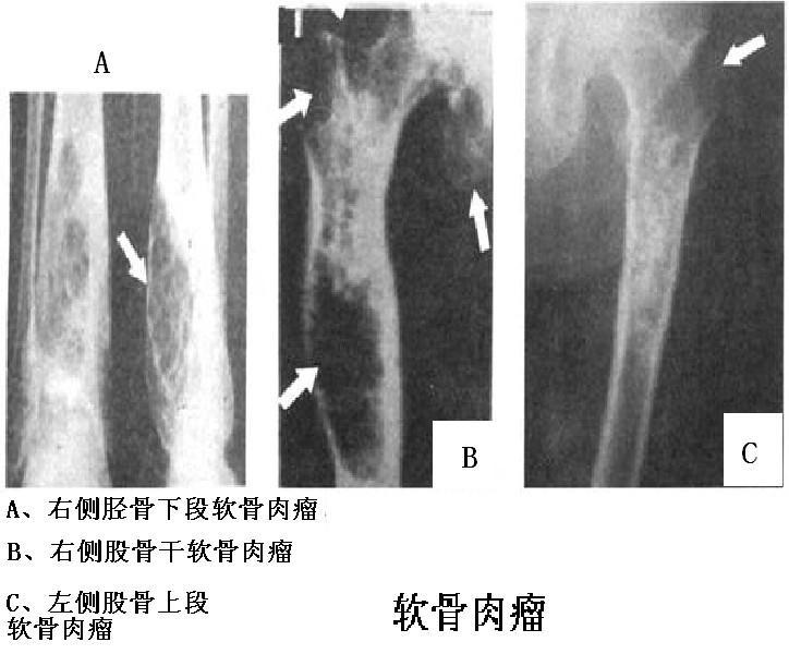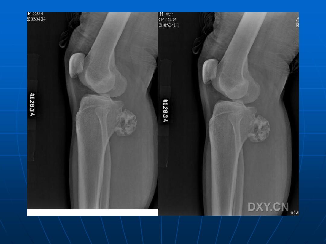 ③惡變成周圍型軟骨肉瘤的發(fā)生率高。應(yīng)與軟骨肉瘤,纖維肉瘤相鑒別軟骨肉瘤在x線照片上的顯影頗不一致。有時長骨的干骺端被腫瘤組織破壞而呈透明的假囊腫樣,囊內(nèi)散在少許鈣化點(diǎn)和骨化。有時瘤組織所產(chǎn)生的大量棉絮狀鈣化塊遮蔽著被破壞的骨缺損處,而形成致密的鈣化陰影。骨軟骨瘤的惡變起始于腫瘤的軟骨帽和其纖維包膜(參閱骨軟骨瘤),軟骨細(xì)胞分裂和軟骨鈣化作用驟然增加,以致在x線照片上發(fā)現(xiàn)多量如棉絮狀不規(guī)則的鈣化點(diǎn),散在于骨軟骨瘤遠(yuǎn)端周圍的軟組織腫塊中。放射樣的骨膜反應(yīng)性新骨增生則不多見,有時或可發(fā)現(xiàn)骨膜三角。當(dāng)軟骨瘤惡變時,骨內(nèi)的溶骨性陰影增大,鈣化點(diǎn)增多,聚集成堆。腫瘤組織有時穿透皮質(zhì)骨,在軟組織中發(fā)展并形成鈣化陰影。皮質(zhì)骨外可能發(fā)生日光放射樣骨膜新生骨反應(yīng)。