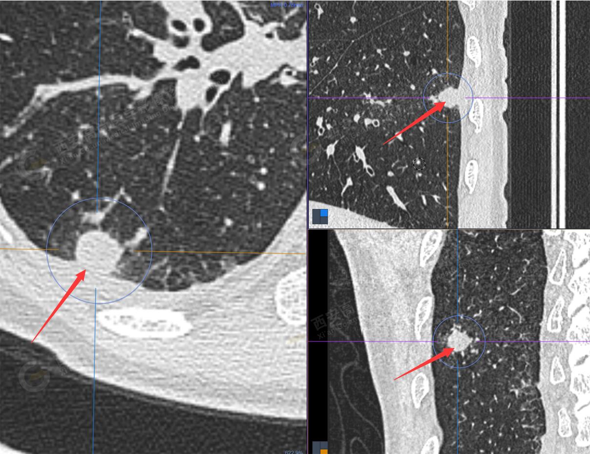 1.右肺下葉后基底段軟組織結(jié)節(jié)(約1.5cm×1.2cm),與相鄰后胸膜分界不清,呈FDG代謝異常增高,結(jié)合病理,符合肺腺癌伴鄰近胸膜侵犯。