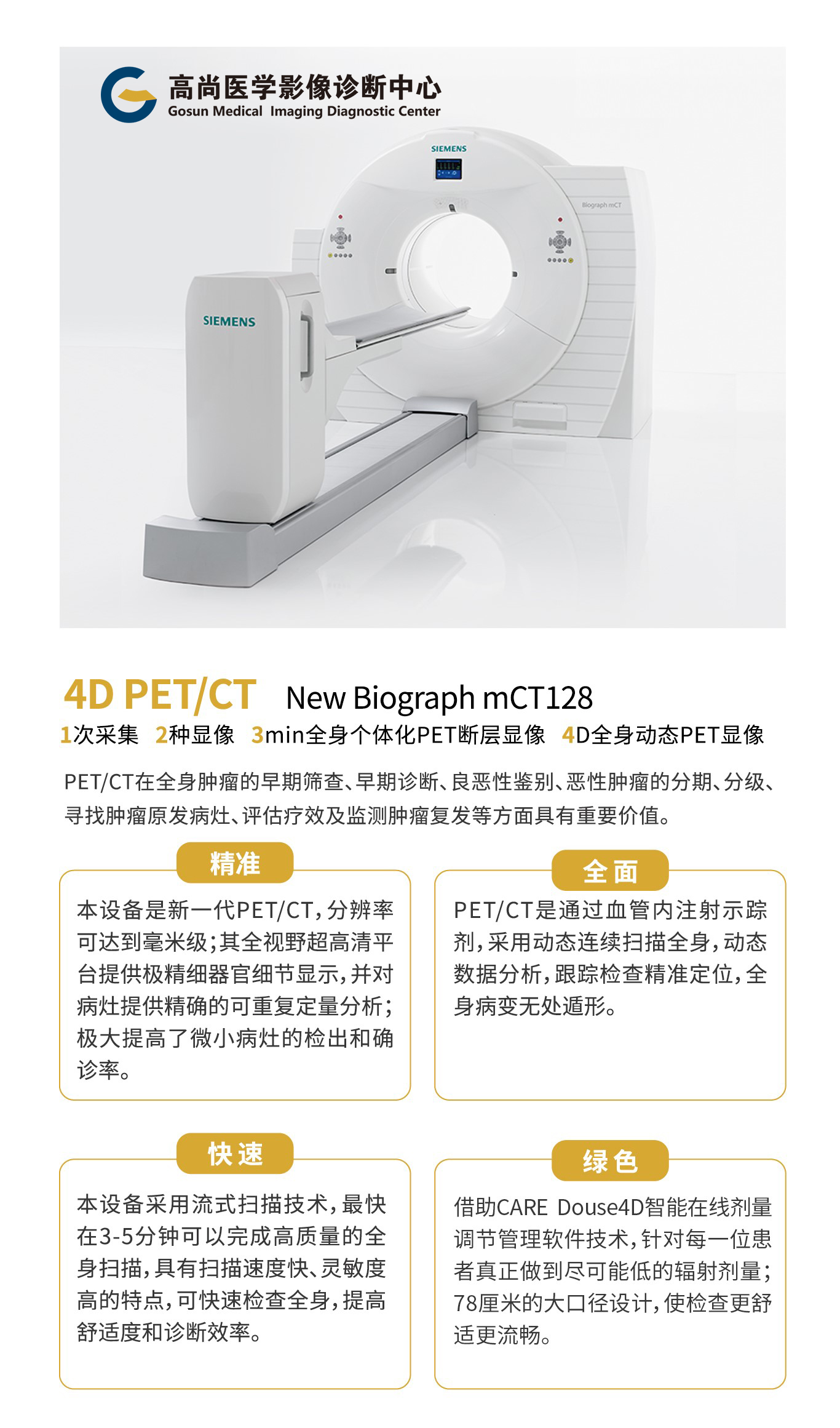 廈門高尚醫(yī)學影像診斷中心引進西門子子全身動態(tài) 4D4D PET/CT,Biograph mCT型號PET/CT是目前全球領先的PET/CT之一。采用全球核醫(yī)學界公認最具發(fā)展?jié)摿Φ母吣苜ゑR射線探測晶體LSO作為PET探測器材料。其采用先進的晶體切割工藝及優(yōu)秀的符合事件探測電子線路設計,具有靈敏度高、準確度高、檢查速度快、輻射劑量低的特點,并且該設備具有業(yè)界公認的最精確的PET定量分析系統(tǒng),可快速、準確地評價腫瘤的治療療效。