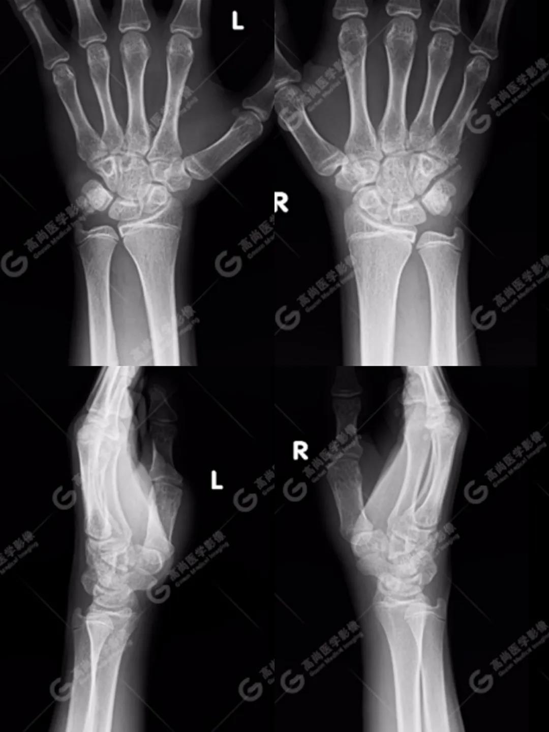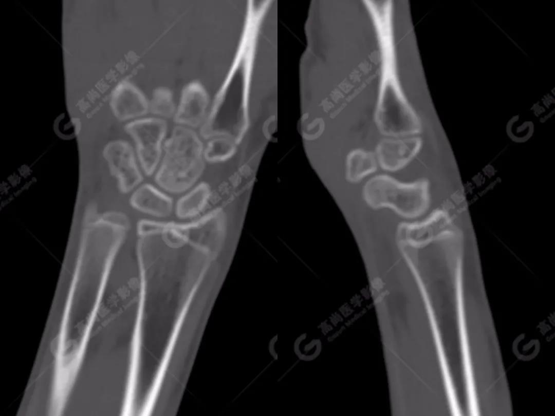 病史摘要 14歲男性,雙側(cè)腕部摔傷1天,雙側(cè)腕關(guān)節(jié)周圍壓痛,右手握拳乏力,按壓疼痛明顯,關(guān)節(jié)活動無明顯受限,體格檢查無明顯骨摩擦感;經(jīng)過一天后疼痛無明顯改善,遂來高尚醫(yī)學影像診斷中心行相關(guān)檢查。
