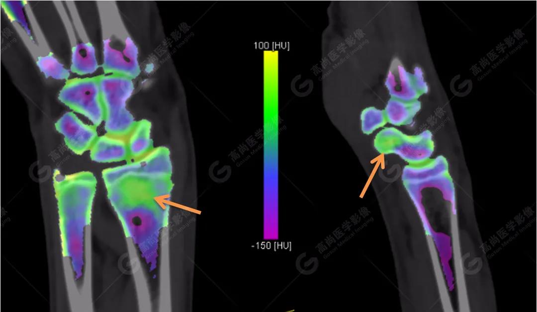 雙能CT骨髓成像圖上發(fā)現(xiàn)了左側(cè)橈骨遠端和右側(cè)舟狀骨骨髓水腫(箭頭所示),進一步查體這兩處骨髓水腫剛好與患者的局部壓痛點相一致。