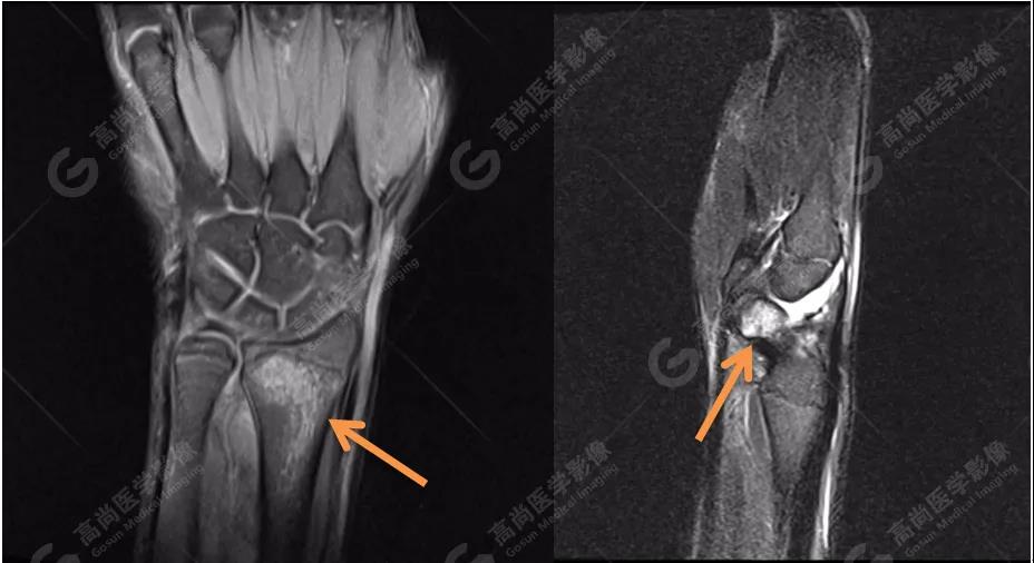 MR質(zhì)子壓脂序列圖像進一步證實:左側(cè)橈骨遠端與右側(cè)舟狀骨骨髓水腫!范圍也與雙能CT骨髓成像圖有很好的吻合度。