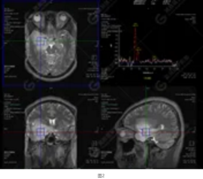 圖1為多體素MRS檢查,感興趣區(qū)為正常腦組織的MRS表現(xiàn)。圖2為單體素MRS,右側(cè)顳葉病灶內(nèi)NAA峰明顯下降,Cho峰明顯升高,NAA/Cr值為0.1,Cho/Cr值為3.64。