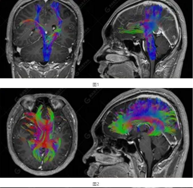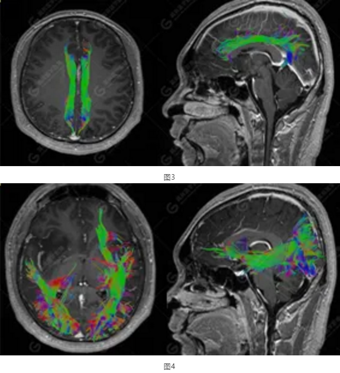 以上為DTI成像,圖1為皮質(zhì)脊髓束,圖2為胼胝體束,圖3為扣帶回束,圖4為額枕束。DTI成像示右側(cè)額枕束前部明顯受壓、部分未見(jiàn)顯示;胼胝體束、雙側(cè)扣帶束、皮質(zhì)脊髓束及左側(cè)額枕束形態(tài)可,纖維束未見(jiàn)明顯破壞,未見(jiàn)明顯稀疏減少。