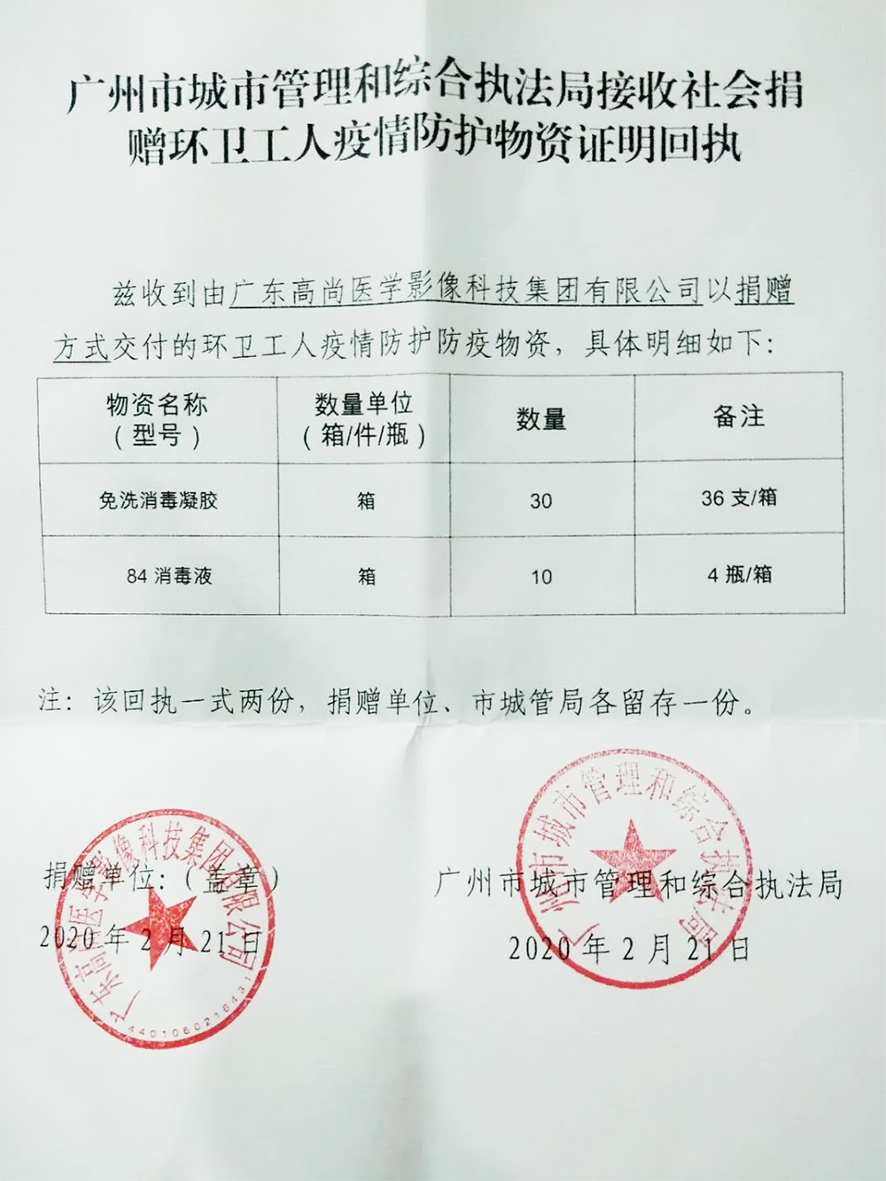 庚子鼠年的春節(jié),他們放棄了春節(jié)與家人團(tuán)聚的機(jī)會,投入到環(huán)境整治一線,為切斷病毒來源、抗擊疫情堅(jiān)守在自己的崗位。高尚醫(yī)學(xué)影像關(guān)愛保障民生的守崗戰(zhàn)士,向廣州市城市管理和綜合執(zhí)法局捐贈免洗消毒凝膠1080瓶、84消毒液10箱等一批消毒物資,用于環(huán)衛(wèi)工人在工作中消毒防護(hù)。